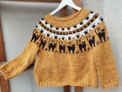 This sweater is worked seamlessly from the top down. First the stranded yoke is worked, then short rows are added to shape the back of the shoulders. The body and sleeves are separated and worked in the round.