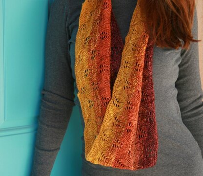 This fingering-weight cowl features an easy leaf motif lace pattern. It is worked in the round from the one edge to the other. The pattern is written to work with a set of Transitional Packs which feature four 100-yard skeins of sock-weight yarn, but would also work great with a single skein of tonal-dyed or gradient yarn. Note that the lace motifs are presented in chart form only.