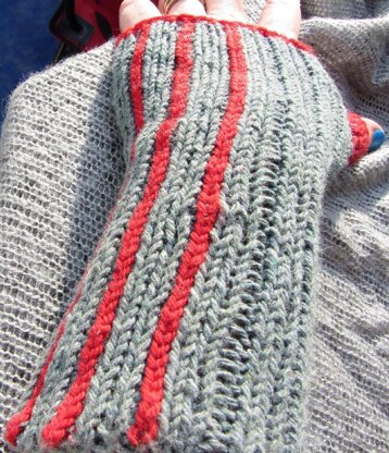 Haiku is a simple ribbed pattern in the round with contrasting coloured edging, thumb and crocheted vertical stripes.