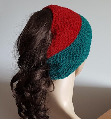This warm and cosy 12ply ponytail or messy bun Beanie is worked in double moss stitch throughout. It can be worked in one or two colours.