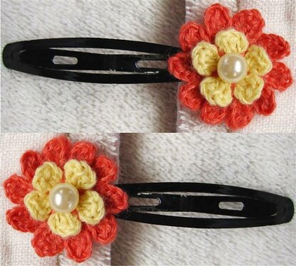 Beautify your hair with nice flower, continuous crochet without sewing. 2 layers flower with yellow and red petals. It can easily be change depend on variety occasion. Simple but cute. Flower is stiffened by spray starch, it can be wash and re-starch. Hope you enjoy it :)