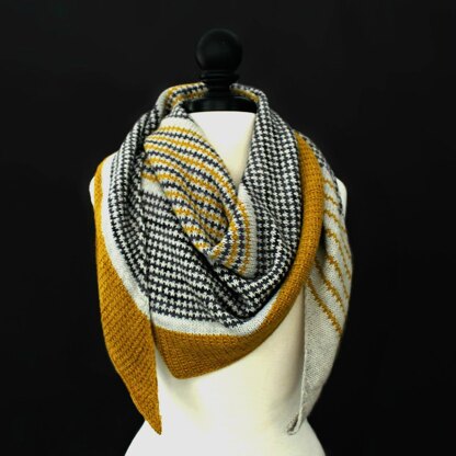 Slipped stitches and stripes combine in Haldimand Bay for a simple but interesting knit. An asymmetrical triangle shawl, it begins with a few stitches and is worked sideways to the bind-off edge, while being shaped with increases along one edge and decreases along the other. An I-cord along the decreasing edge allows the resting yarn to be carried easily up the side in the colorwork sections, and tucked neatly out of sight.