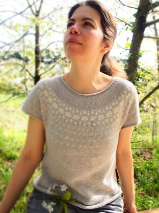Hanafubuki is a circular short sleeve yoke that is worked seamlessly from the top down. The neck is worked in plain stockinette, to form a nice rolling out edge, after that, several series of short rows are used for a comfortable and beautifully shaped finish.