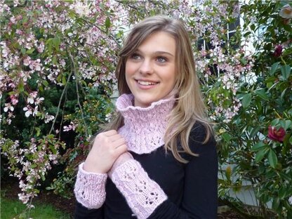 I was inspired to design this cowl and cuffs set by the beautiful Sakura yarn that Knitted Wit dyed as a fundraiser for Japan disaster relief. Sakura is Japanese for cherry blossom, and Hanami is the name given to the spring cherry blossom viewing parties.