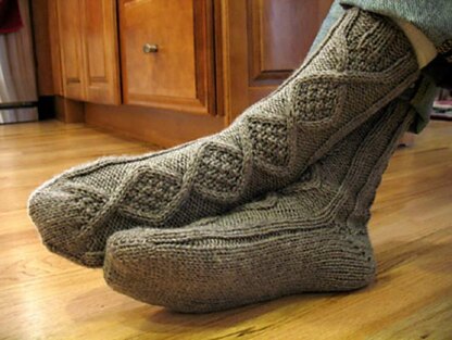 Meant to be worn around the house slipper socks, perhaps over a pair of regular cotton socks, these toe-up socks knitted up quickly on U.S. Size 7 DPNs. The diamond cable pattern on the front and the braided cable up the back are separated by smart ribbbing that's easy to work, easy to remember and makes a snug, stretchy sock. (Seriously, once I worked the charts once I didn't have to refer to them again -- the pattern is that easy to memorize, but still really fun to work.)