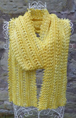 Sometimes you just want to hang loose with your knitting and let your mind wander, but not endless garter stitch. This light reversible summer scarf is knit lengthwise to get into a rhythm with simple easy to remember short stitch repeats. The picot cast on and cast off add a special touch. Knit on large needles to make the openwork really open up, give drape and also give a lot of ‘bang for your buck’ – perfect to showcase that single skein of special yarn. The scarf will look great using tonal, solid, semi-solid or long colour repeat yarns. Actual size will vary depending upon how it is blocked.