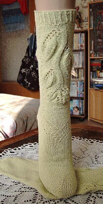 Beschreibung: Diese Socken sind von oben nach unten, mit einem Blattdesign, gestrickt mit Anleitung für Herzchen-Ferse und Stern-Spitze.