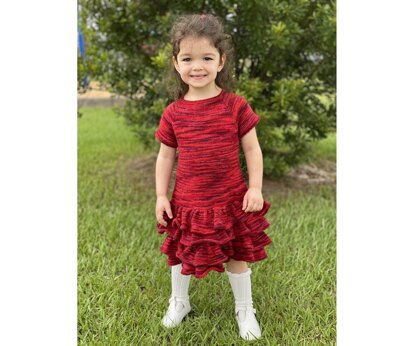 Hanna Jane has an ultra girly feel to it, and will become an heirloom piece to be handed down from baby to baby. Top-down construction, with a fitted chest, and a multi ruffle skirt.