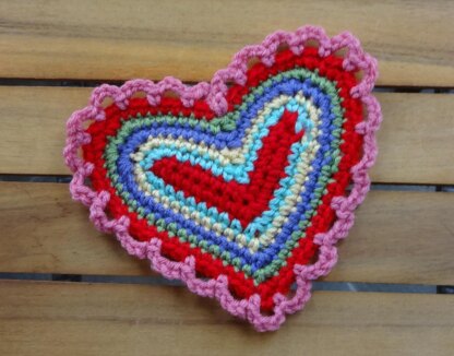 This colorful crochet heart works up quickly. It's fun to make, a great stash buster, and suitable for a beginner with some experience. The example is made in 6 colors of Red Heart Super Saver, but any worsted yarn can be used. Tthe heart measures about 7” across the widest part by 5.5” down the middle and about 6.5” from highest edge to lowest point. It can be used as an applique to decorate other items and projects or made into a hanging decoration or a magnet.