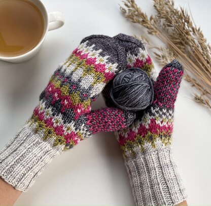 Happy Mittens are a perfect scrap yarn project. You can choose any color combo that you like and play with your left-over yarns. Use DK-weight yarn or fingering weight held double.