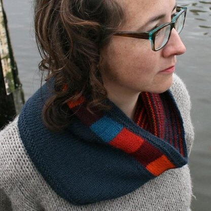 The warm lights of home on a cold night. In cosy Alpaca, this double-layer cowl will keep out the chills. Turn down the top for a flash of stripes, or wear it inside out and reverse your options. The colourwork is all simple stripes, no intarsia. You will also need to be able to pick up stitches and work a 3-needle bind off. Choose whether to work flat, or work in the round for a seamless finish.