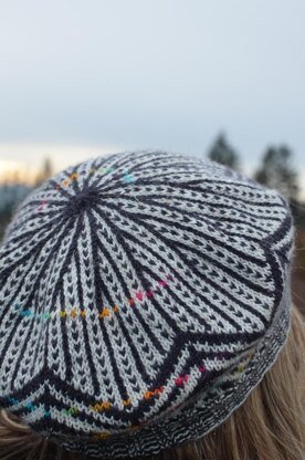 Hard Rime is that milky ice that forms on object during a cold snap with freezing fog and wind. Under an electron microscope the top has these little spikey points that are echoed in single pops of contrasting color. The sides of the ice crystal have parallel lines with smaller branches that break of and meet in regular points like the sides of the hat.