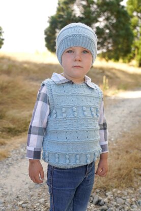 A multi textured vest with a matching hat, a fun project to knit with simple textures, bobbles and eyelets.