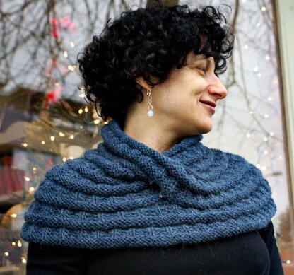 The Harmonia’s Rings family of patterns use Cat Bordhi’s Moebius cast on to achieve the mysterious spiral neck shape; they feature a stitch pattern that creates concentric rings reminiscent of ancient architecture. This cowl sits cape-like over the shoulders, and suits a wide range of body types.