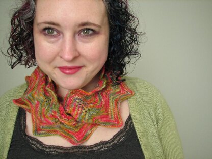 Harmonize is an infinity cowl in two sizes. The long version is 50" and can be worn singled or doubled up. The short version is 20" and lays closely against your neck. It is knit in the round, harmonizing sharp sassy chevrons with lacy feather and fan.