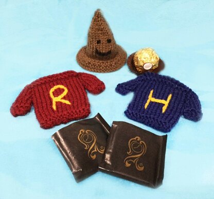 This knitting pattern is of a Harry Potter inspired jumper mint cover, which fits After Eight mints. There is also a Sorting Hat which can hold a Ferrero Rocher. They are ideal for presents to others, a table decoration with mints in or as fundraising items.