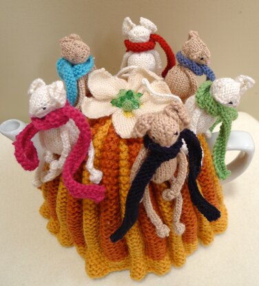 This is a real fairy story tea cosy. Six sweet little mice all sitting in a circle around a beautiful flower they have found. Each mouse has a different coloured scarf and the centre of the flower is beaded for a bit of extra pizazz. Take your time when sewing up the little mice and your patience will be well rewarded. Knitters with some experience will find this an exciting project and a great gift for tea lovers and collectors of tea pots and tea sets.