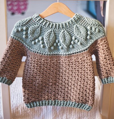 Harvest Sweater is worked top down. You start with the yoke, collar is worked later, and you begin with the best part of the sweater – leaves and bobbles. Bobbles are worked on the right side, so you will have to take care that you make them stay on the right side when working next stitch. I suggest to use merino wool for this sweater, as it is very soft and stretchy, which is important, especially for smaller children, to stay warm and comfy.