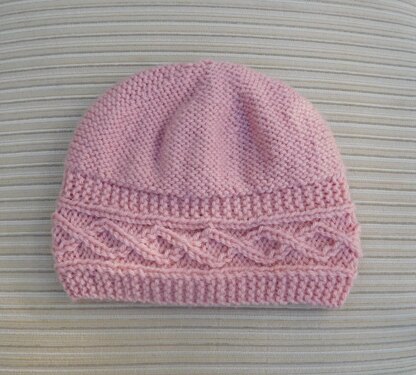 The border of this hat is made sideways, then stitches are picked up and the top is worked in the round.