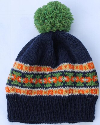 This is a classic unisex hat with a simple Fair Isle border. The pom pom adds fun and any of the colours from the pattern can be used to make it. The hat comes in one size that will fit an adult. I have used 5 colours of yarn for this project. Two 25g balls of the main colour are needed and part balls of the other 4 colours.