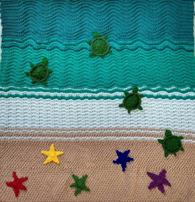The Hatchling’s Journey Baby Blanket is a 36” by 36” baby blanket knit in worsted yarn. Directions for the turtle hatchlings and for the sea stars are included.
