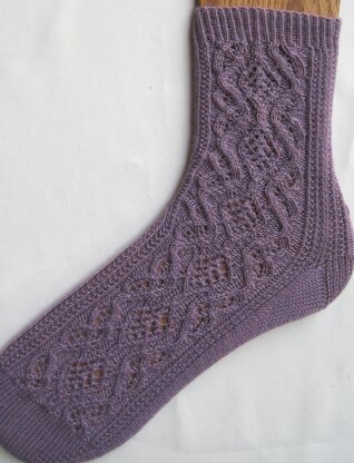 This pattern is for a pair of ornate cable lace socks. The cable itself is a Canadian cable that is just perfect for socks, that comes to us from the creative mind of Annie Maloney. There’s enough “give” to make them comfortable, but enough unusual cabling to make them interesting to look at and fun to knit. The back and front are the same until the heel flap.