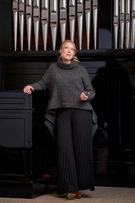 Hayami – rare and unusual beauty in Japanese - is a high-low pullover in stockinette stitch with a cabled Kangaroo pocket and swinging side panels that ends in a high turtleneck collar. The side panels are picked up and knitted after the side seams are done. The pocket is knitted at the end. Wear it as you like; hanging loose or gathered with a belt or with a shawlpin at the front. Hayami is knitted in the pelt wool yarn Tinde with lustre from Hillesvåg Ullvarefabrikk.