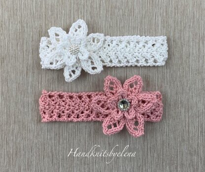 The beautiful flower on this headband consists of two parts: a large flower with lace petals and a small flower in the center. The lace band is knitted sideways. It's very easy and fast to knit!