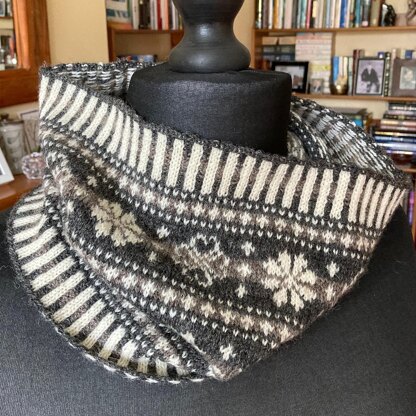 A warm and comforting stranded cowl designed to match the Heart in my Hands Mitts and Hat. Worked in the round from the bottom up it can be easily adapted in both circumference and height; various options are given within the pattern.