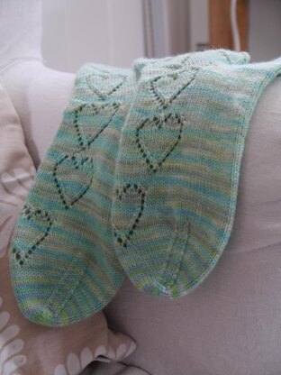 Gorgeous socks knitted using a cuff down construction, a holeless short row heel and a wedge shaped toe. The heart motif finishes them beautifully. The pattern is adaptable so you can include as many or as few hearts as you would like. Have a simple row of hearts around the ankle, or continue them all the way down the foot ending with a central heart on the toe. Two sizes available: M & L