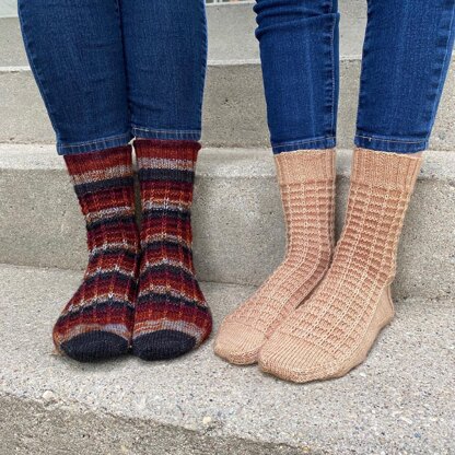 This pattern can be knit toe up or cuff down, and with sock weight yarn or sport weight yarn, and instructions are provided for both. The pattern stitch looks quite different depending on the yarn used - a tonal yarn looks very geometric, and a self striping yarn carries one colour into the next for a unique look. Instructions are provided for a heel flap and gusset, but your preferred heel method or pattern can be substituted.