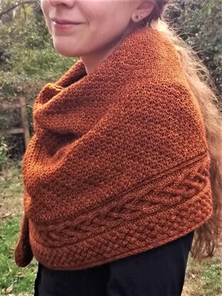 Hearthfire is an asymmetrical triangular shawl knit on the bias. It features a richly textured body and two different cables running along the bottom edge. The shawl begins with a provisional i-cord cast-on, from which extra stitches are picked up to form the shawl body.