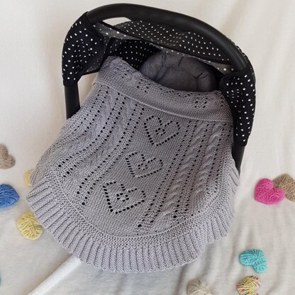 This is a carseat blanket to match my Cable and Lace cot blanket, featuring similar elements - cables, lacey hearts and pleated border which is knitted separately and then sewn on.