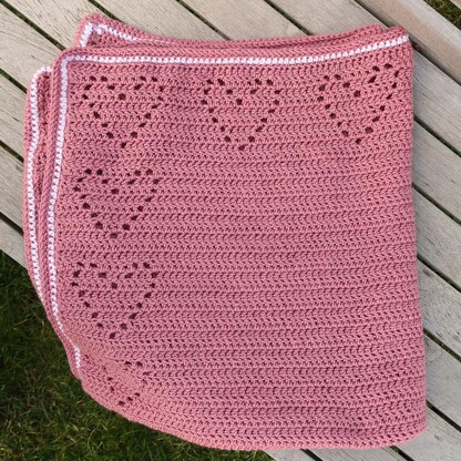 The Hearts Baby Blanket is a cute beginner crochet blanket pattern using filet crochet (chains, skipped stitches and double crochet) to form a heart pattern all around the blanket.