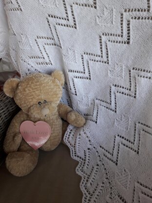 Lightweight shawl, knitted in 4ply yarn in a lace zig zag and textured hearts pattern. Measuring approx 48" square it's ideal for wrapping baby in. It can also be folded to make a lightweight but warm pram/crib/car blanket.
