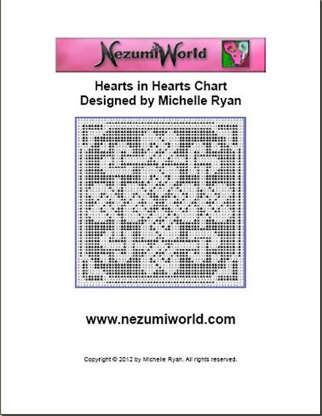 Interwoven knotwork hearts in hearts chart (with first row is written for both a 1 x 1 & 1 x 2 filet crochet grid). Additional information sizes using different yarns is also included. i.e. Using Crochet Cotton Thread size 10: approx. width = 13.1 inches, height = 14.2 inches, Using Worsted Weight Yarn: approx. width = 51.3 inches, height = 52.4 inches. Uses American crochet terms. This makes a table settings, chair back or lapghan (depending on yarn/ thread used) for your home.