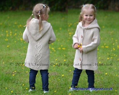 Hearts Queen Coat is must have for your little fashionista wardrobe. The design of the coat is pretty and simple. The close fitting on the waist is combined with raglan sleeves and pixie hood. Coat is knitted in pretty cream color and decorated with contrast color wooden buttons. This stylish and fancy to wear coat is knitted with garter stitch and easy to memorize heart cable on the back. Back, front parts and sleeves are knitted separately up to underarms, then all parts are placed together the circular needles and finished up together. The coat is knitted with Aran weight yarn The knitting pattern is easy to follow and suitable for intermediate knitters. It has 6 pages of instructions, cable chart with row-by-row instructions and photos.