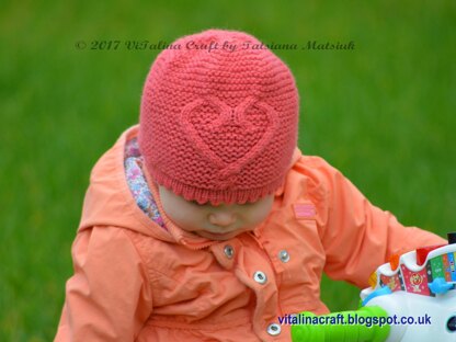 This pretty and easy to knit hat is knitted in the round with Aran weight yarn. Textured garter stitch combined with cable heart motif at front and the edge of hat is made with a fancy jagged edge.