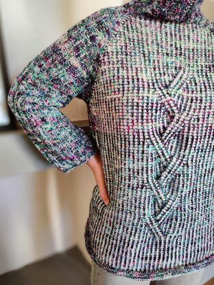 This delightful turtleneck sweater in Tunisian crochet is worked top-down and in the round, using basic Tunisian rib stitches. The neckline and sleeves are worked in a 3x2 classic ribbing, while front and back are in “brioche” ribbing. On the front only of the sweater, a sinuous, “leafy” faux Cable design is created through clever increasing and decreasing.