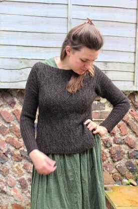 Transitional seasons inspired the silhouette of this design. Whilst still being woolly and warm, splits in the sides and a slash neck design features allow cool breezes to penetrate the jumper on the warmer days, and still having a lot of layering potential. The casual fit of a dropped shoulder is smartened up with fitted rib sleeves. Twisted stitches cover the entire front and back pieces, their detail and intricacy hidden within the beautiful natural Hebridean wool tones. The jumper is knit in pieces, from the bottom up and sewn up at the end. The slits can be sewn to your preference of not at all.