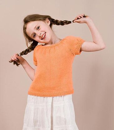 Heidi is knit seamlessly in the round from the top down. This worsted weight summer top features a gathered round yoke, pleated sleeves and moss stitch trims.