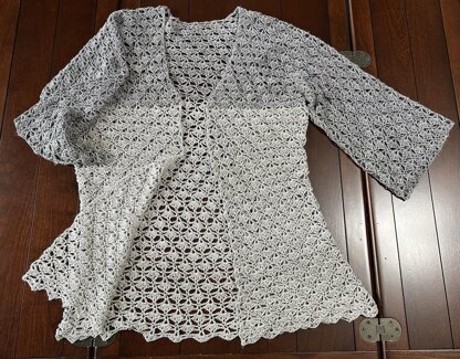 Pattern uses measurements to fit. This garment: 48 inches along sleeve to sleeve ends 44 inches at bust 29 inches neck to hem All measurements are after blocking Photos included to indicate use of tape measure, blocking, and stitch marker placement.