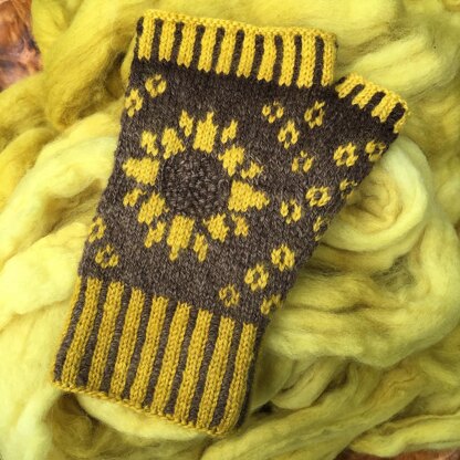 Marigolds are a very popular flower in the midwestern United States, as are sunflowers (the Kansas state flower). The Helianthus Mitts pattern pairs handspun marigold dyed fiber with a stranded colorwork design featuring a sunflower. In addition, the project uses handspun black walnut (the Missouri State Nut) dyed fiber, another local source of dyestuff found in the midwest that is easy to use as a natural alternative to chemical dyes.