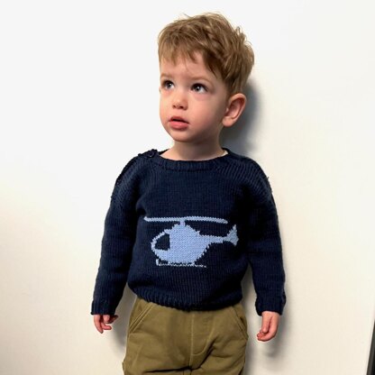 The helicopter sweater is knit back and forth in stockinette in 4 pieces, front, back and two sleeves from the bottom up.