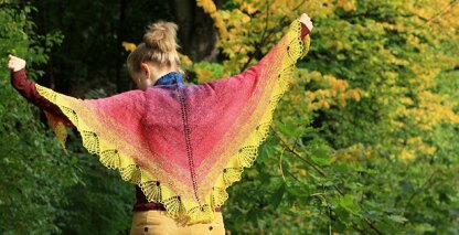 Heliocentrism is a triangular shawl with increases along the border and center. The large stockinette portion allows you to either show off a gradient yarn or create your own by mixing several threads. The shawl can be enlarged by working additional repeats. The pattern is charted.