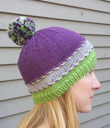 Add a new accessory to your fall and winter attire with the Helix Hat. The hat is constructed from the brim to the crown. Its stripe is encompassed by spirals creating a small but bold statement. No colorwork is involved. The hat is topped off with a big pom-pom.