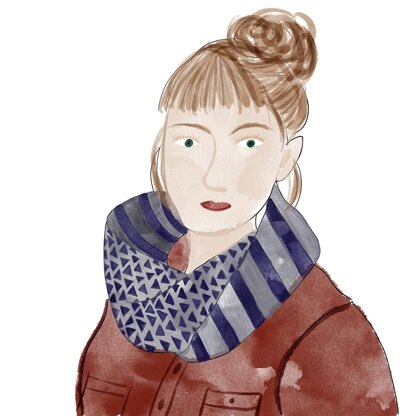 This cowl is worked in the round to create a tube, twisted once and then grafted together using kitchener stitch. Half the cowl showcases a triangular colourwork motif while the other displays eye-catching stripes.