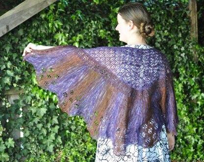 Hemigraphis is a floral shawl/shawlette with a triangular centre and wide semi-circular knitted on border. The border shaping uses short rows, and the two colours are carried the length of the edging with a floral band worked using both yarns held together. The floral band sits comfortably around the shoulders.