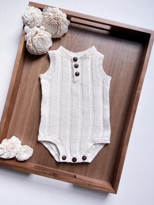 Knitting pattern for ribbed henley baby romper, gender-neutral wardrobe addition for babies and toddlers. It can make a perfect welcome baby gift and a stash-buster!