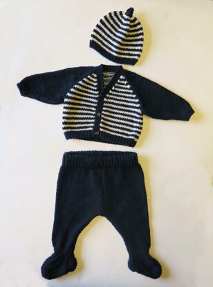 Baby set with Raglan seamed cardigan, leggings with optional feet and hat with icord.